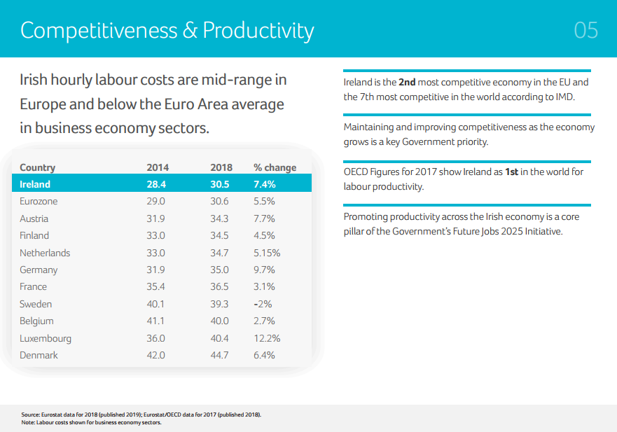 據(jù)IMD報(bào)告,愛爾蘭是歐盟第二大及全球第七大最具競(jìng)爭(zhēng)力經(jīng)濟(jì)體。另據(jù)經(jīng)合組織(OECD)報(bào)告,愛爾蘭勞動(dòng)力被列為世界上生產(chǎn)效率最高的勞動(dòng)力。2011-2017年度IBM全球區(qū)域趨勢(shì)報(bào)告,愛爾蘭更是連續(xù)6年蟬聯(lián)“吸引全世界高價(jià)值項(xiàng)目投資”全球第一。