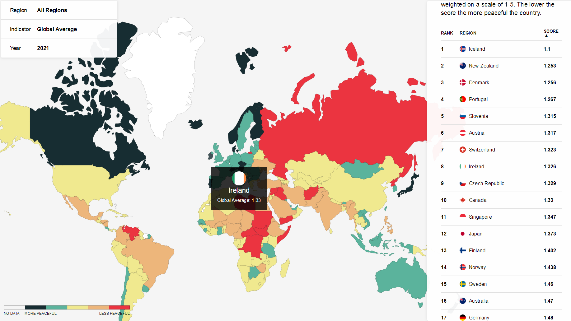 2021年,冰島再次蟬聯(lián)全球最和平國家,新西蘭、丹麥緊隨其后,分獲第2、第3名。對比2020年排名,新加坡跌出前十,愛爾蘭前進(jìn)3位取而代之。此外,日本排名第12,澳大利亞排名16,英國排名33,而美國排在第122名。
