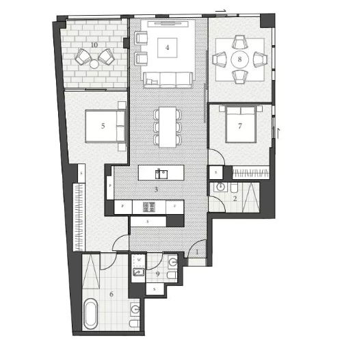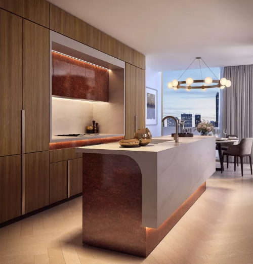 公寓的外觀由國(guó)際著名的澳大利亞建筑公司FJMT操刀設(shè)計(jì),室內(nèi)設(shè)計(jì)由FJMT Interiors負(fù)責(zé)。采用奢華代表的家電品牌Gaggenau以及Fisher & Paykel。