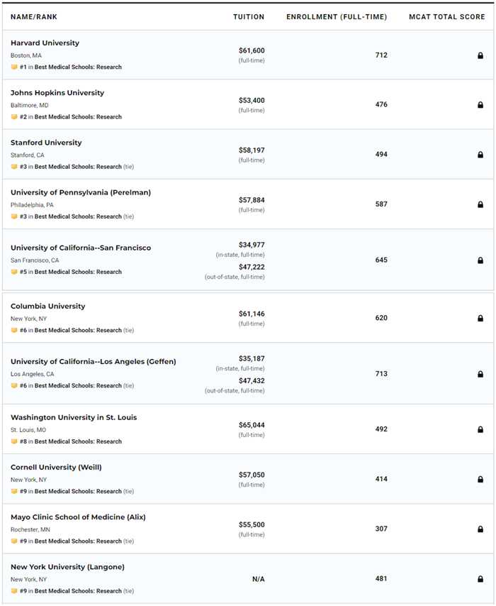 不過,不管是醫(yī)學(xué),還是護理,國際生都不多。不是每所醫(yī)學(xué)院都招國際生(有綠卡的孩子就沒有這層顧忌),部分醫(yī)學(xué)院可能只有一兩個方向?qū)α魧W(xué)生開放。下面是Research方向的TOP10排名: